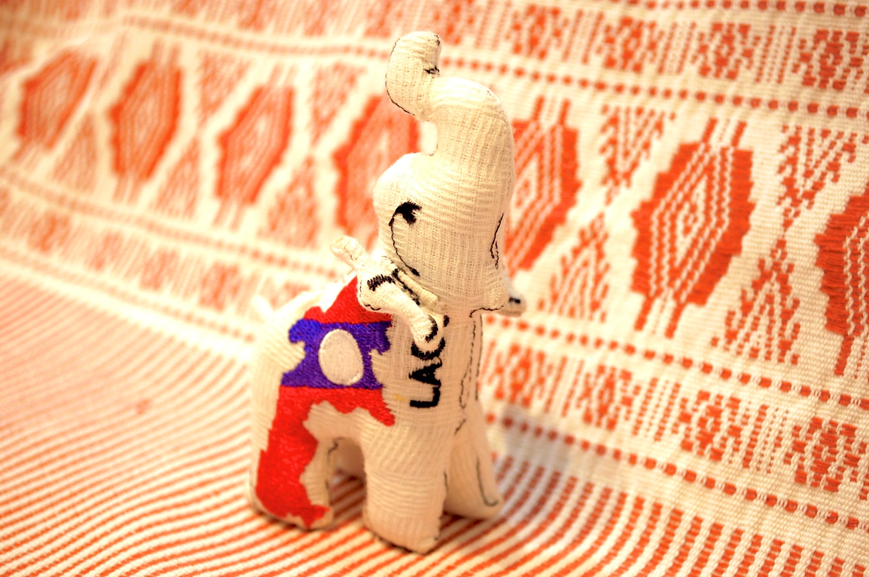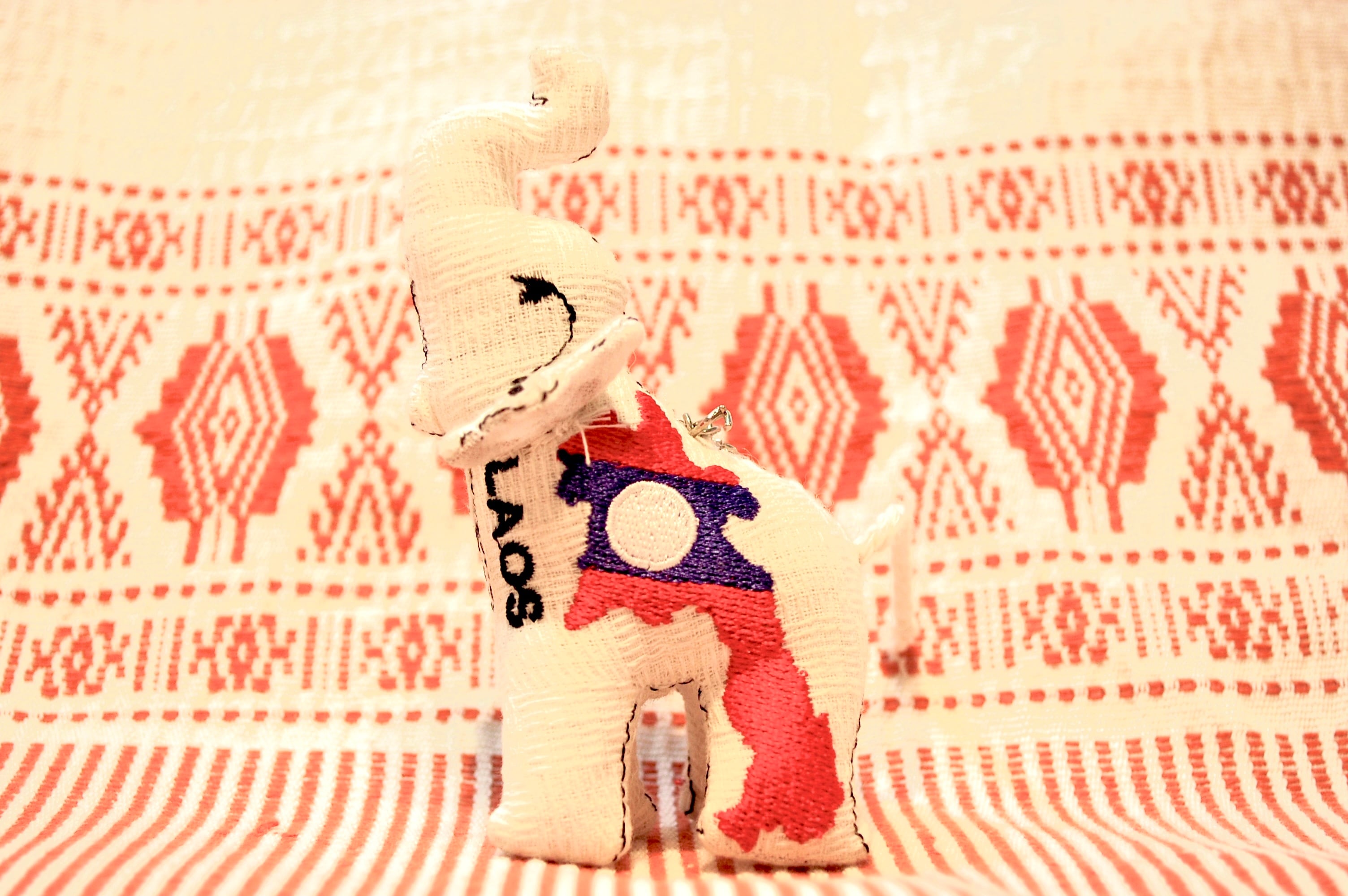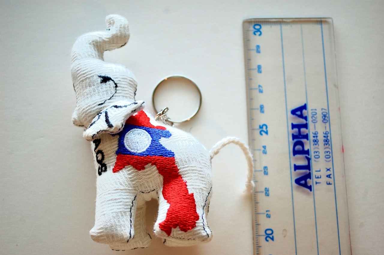 LAOSの文字と、ラオスの国土の形が国旗のモチーフで刺繍されたコロンとした形のゾウのストラップです。